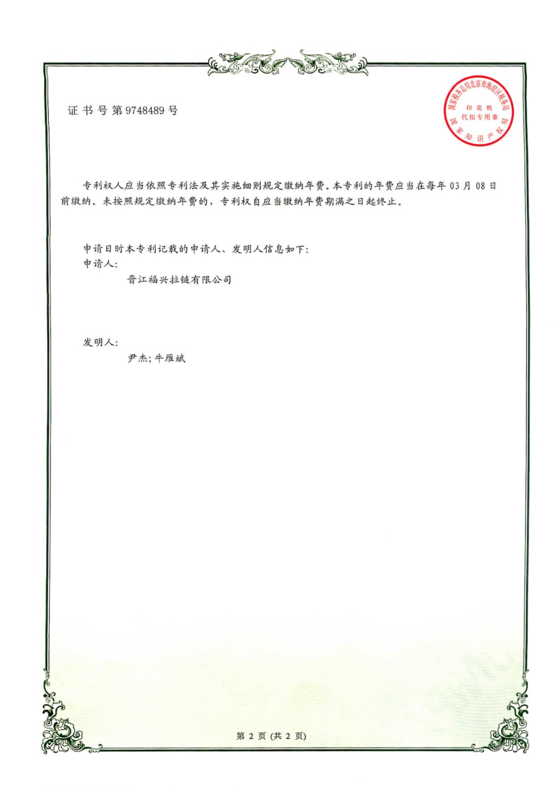 实用新型发明专利(第748489号)